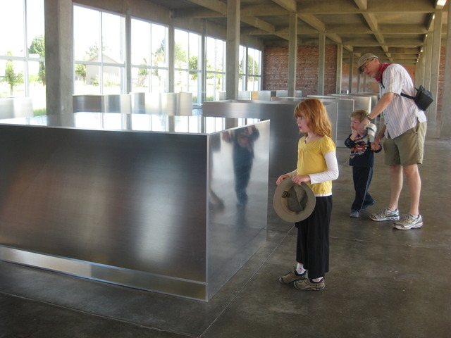 This are 100 untitled works made from mill aluminum by Judd. They are in two large, long buildings with glass on either side. At the entrance there's a small panel of the aluminum so the guide can show kids (and adults) how even a finger touch can ruin the surface of the metal, so a lot of this part of the tour was keeping the kids from touching anything.