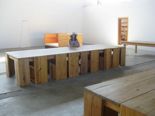 The next section was a large warehouse sized building that Judd converted into a public space. We asked if it was still used and the guide said there had been a big event there just the night before. Here's one of the outdoor tables and Alison sitting at one of the indoor tables.