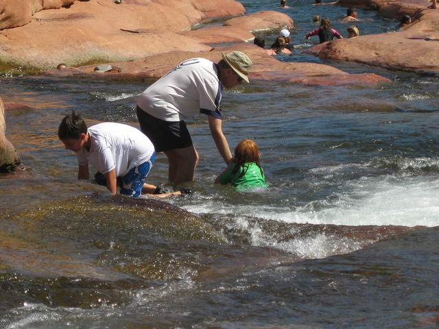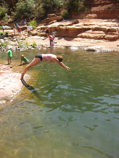 The most fun was going to Slide Rock State Park. This is part of Oak Creek Canyon where the creek has carved out an area full of shallow and deep, fast-moving and quiet places to swim, and the water is crystal clear (and, the day we were there, ice cold).