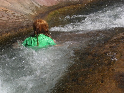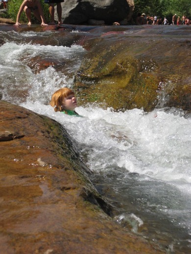 The place is called Slide Rock because there's a seventy foot long section where the water has smoothed the rocks, and a kind of moss has grown over the rock, making it very slippery (there are sections like this where you're not supposed to or ready to slide where the footing is very tricky). Alison and Cielo both went down the slide - here is Cielo just before and just after she passed Alison, who had the camera.